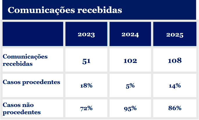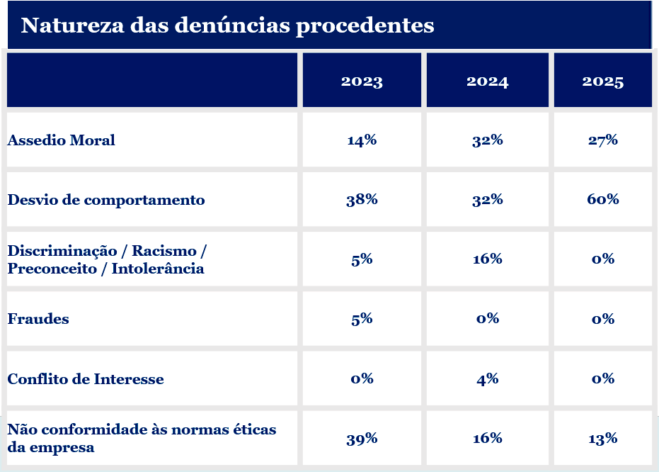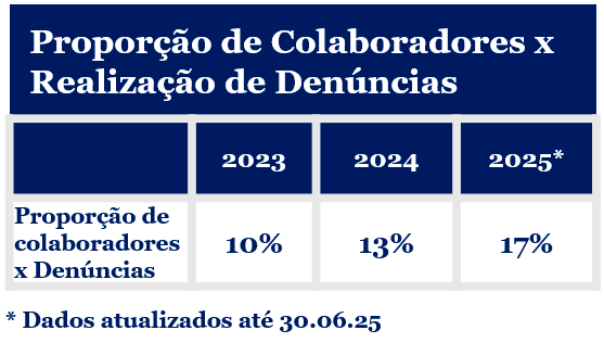 Todas as denúncias recebidas são utilizadas para a reavaliação anual de nosso programa de integridade.