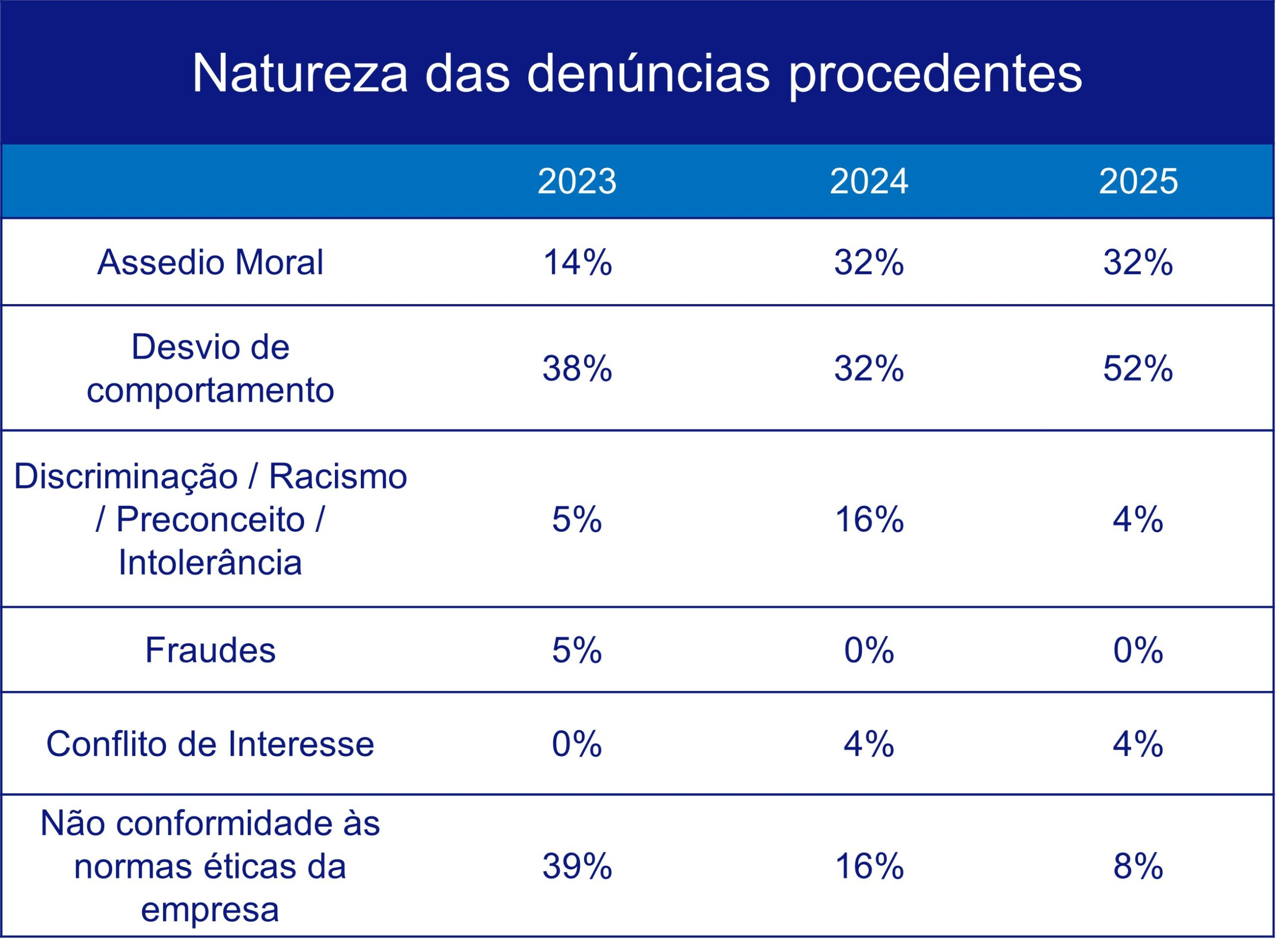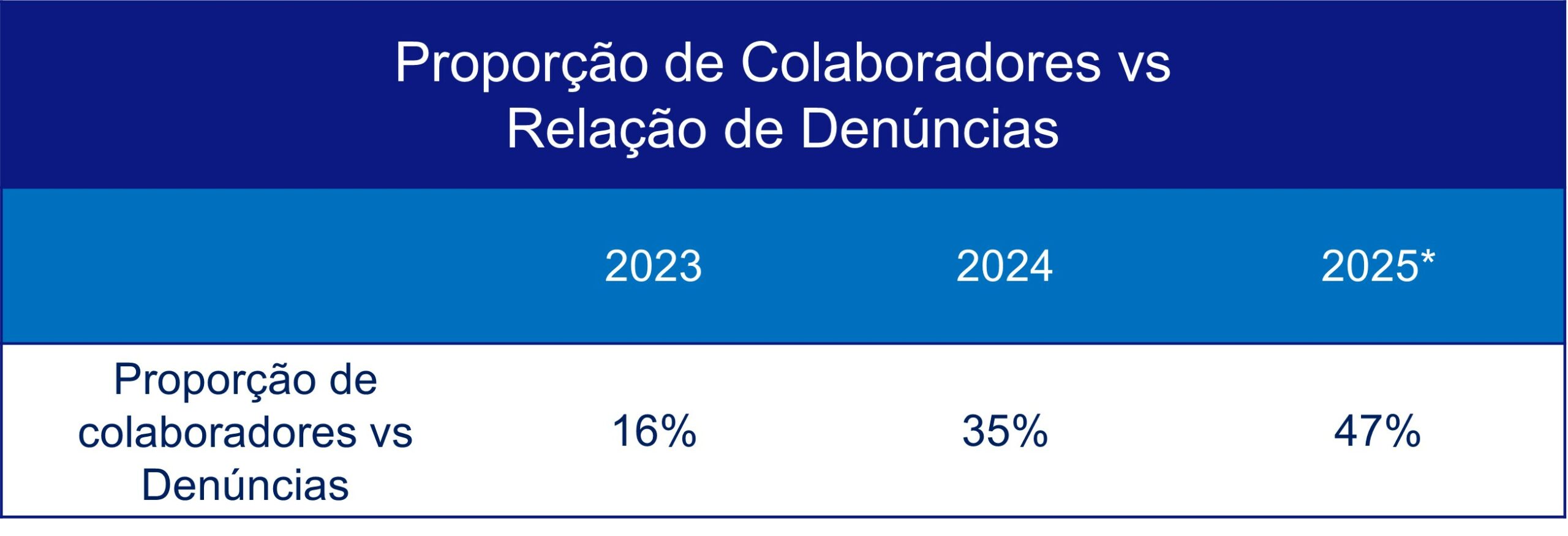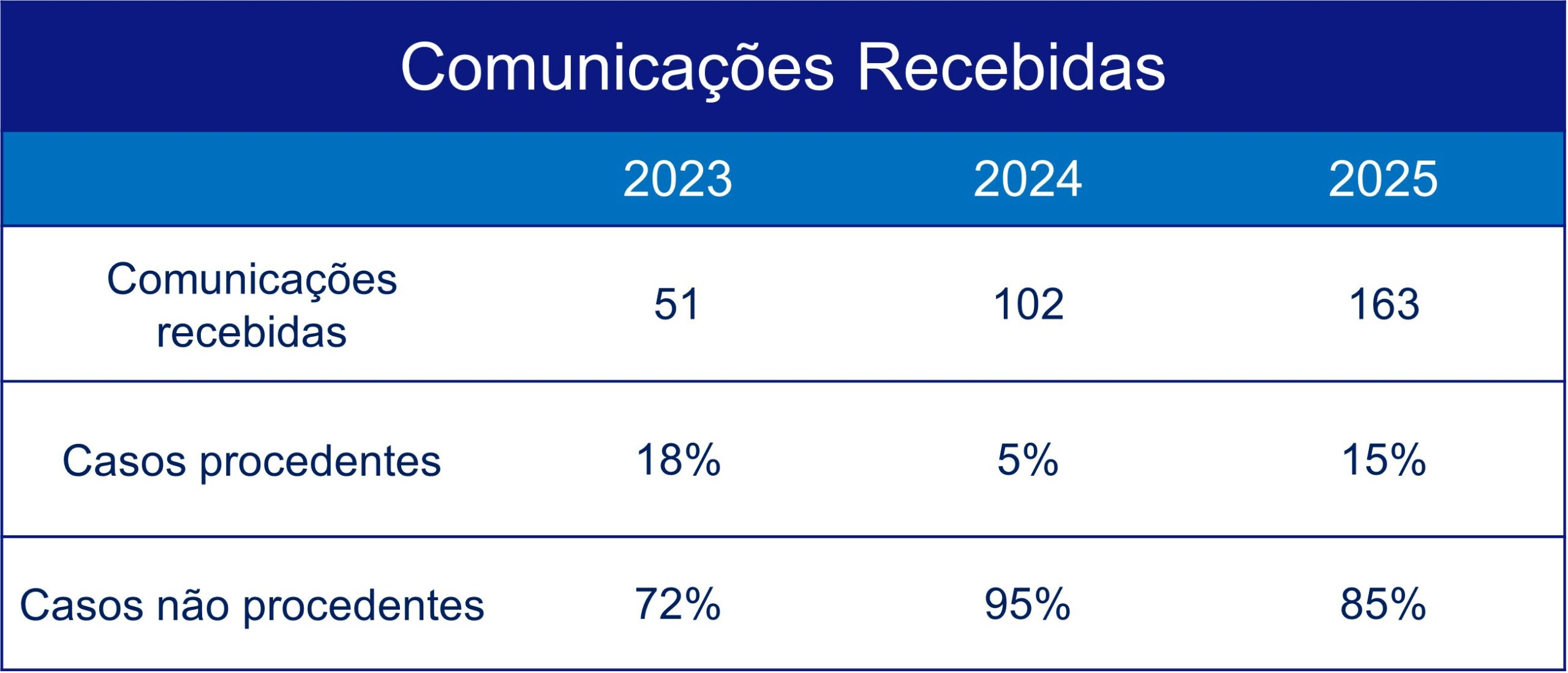 Todas as denúncias recebidas são utilizadas para a reavaliação anual de nosso programa de integridade.
